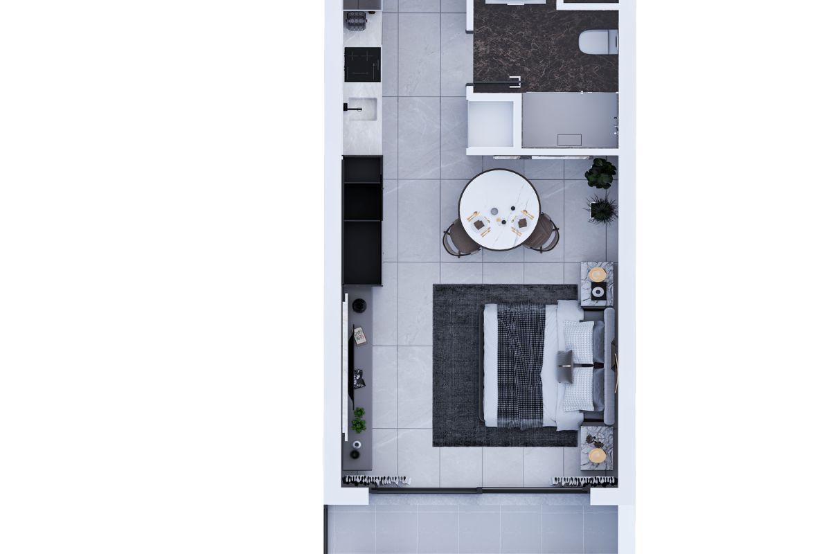 D-Point’in mimari vizyonu zarafet ve işlevselliği birleştirerek Akdeniz çevresiyle uyum içinde lacivert ve altın tonlarında çağdaş bir cephe sergilemektedir. Geniş pencereler iç mekanları doğal ışıkla doldurarak ferah düzenlemeleri ve üstün işçiliği vurgulamaktadır. Her stüdyo daire detaylara özen gösterilerek tasarlanmış olup, stil ve konforu dengeleyen yüksek kaliteli malzemeler ve rafine bitişler içermektedir.